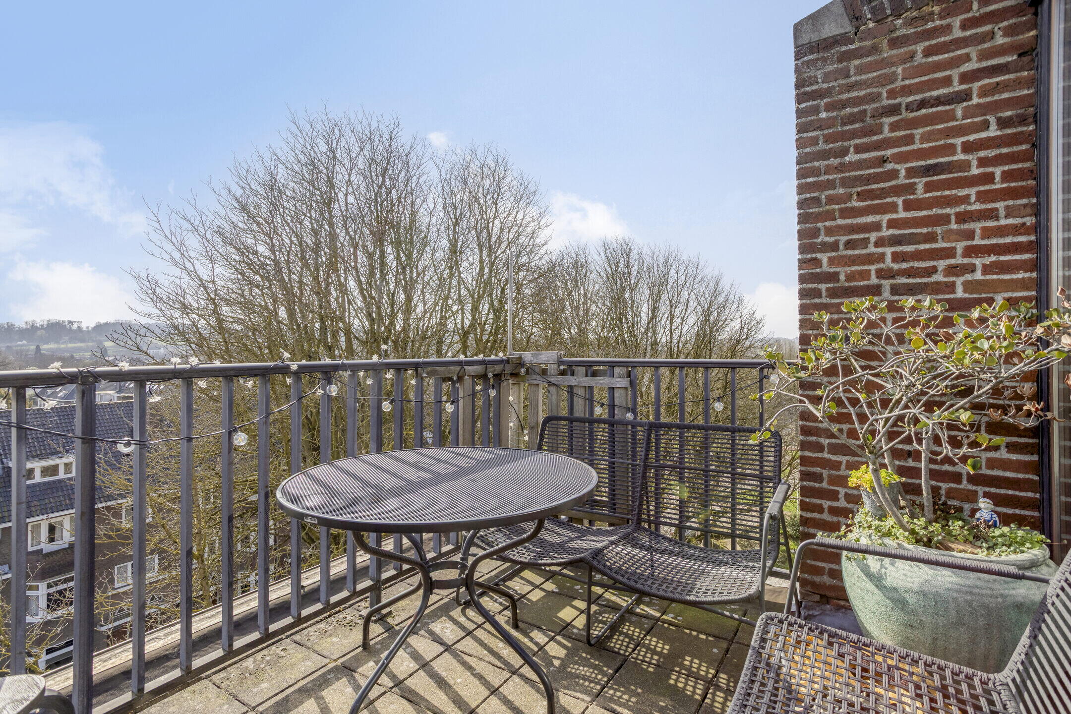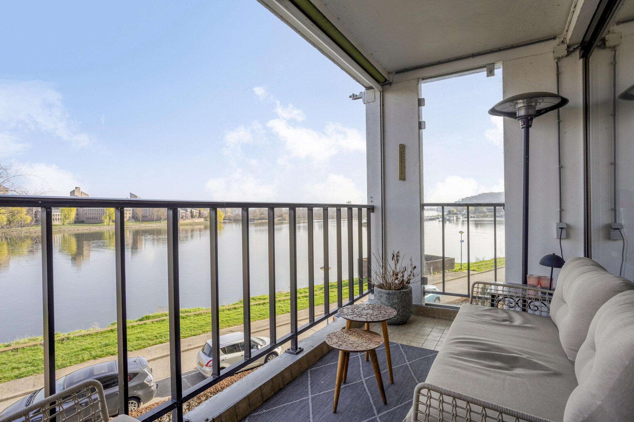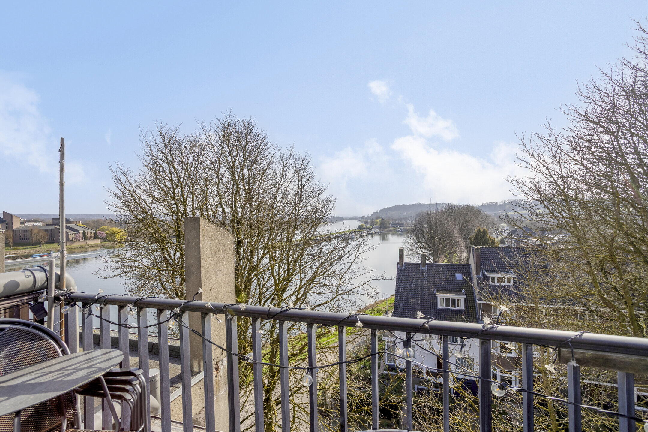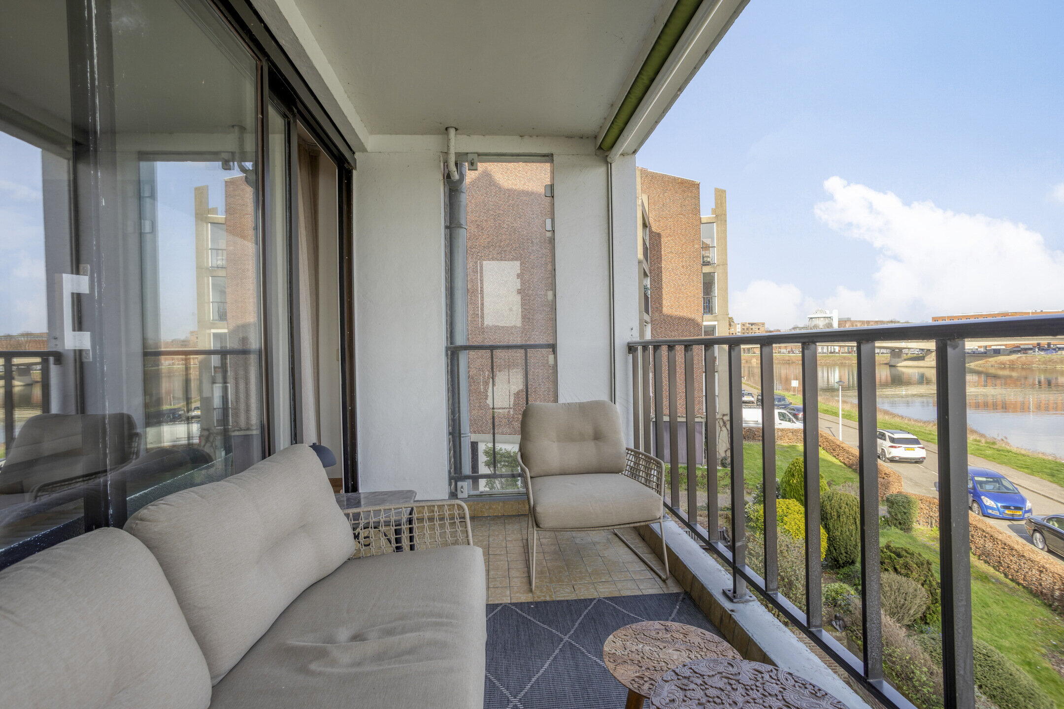 - Balkon (ca. 7 m2, afm. 3,02 x 2,32 m) met een panoramisch uitzicht over de Maas richting de jachthaven en de Sint Pietersberg;