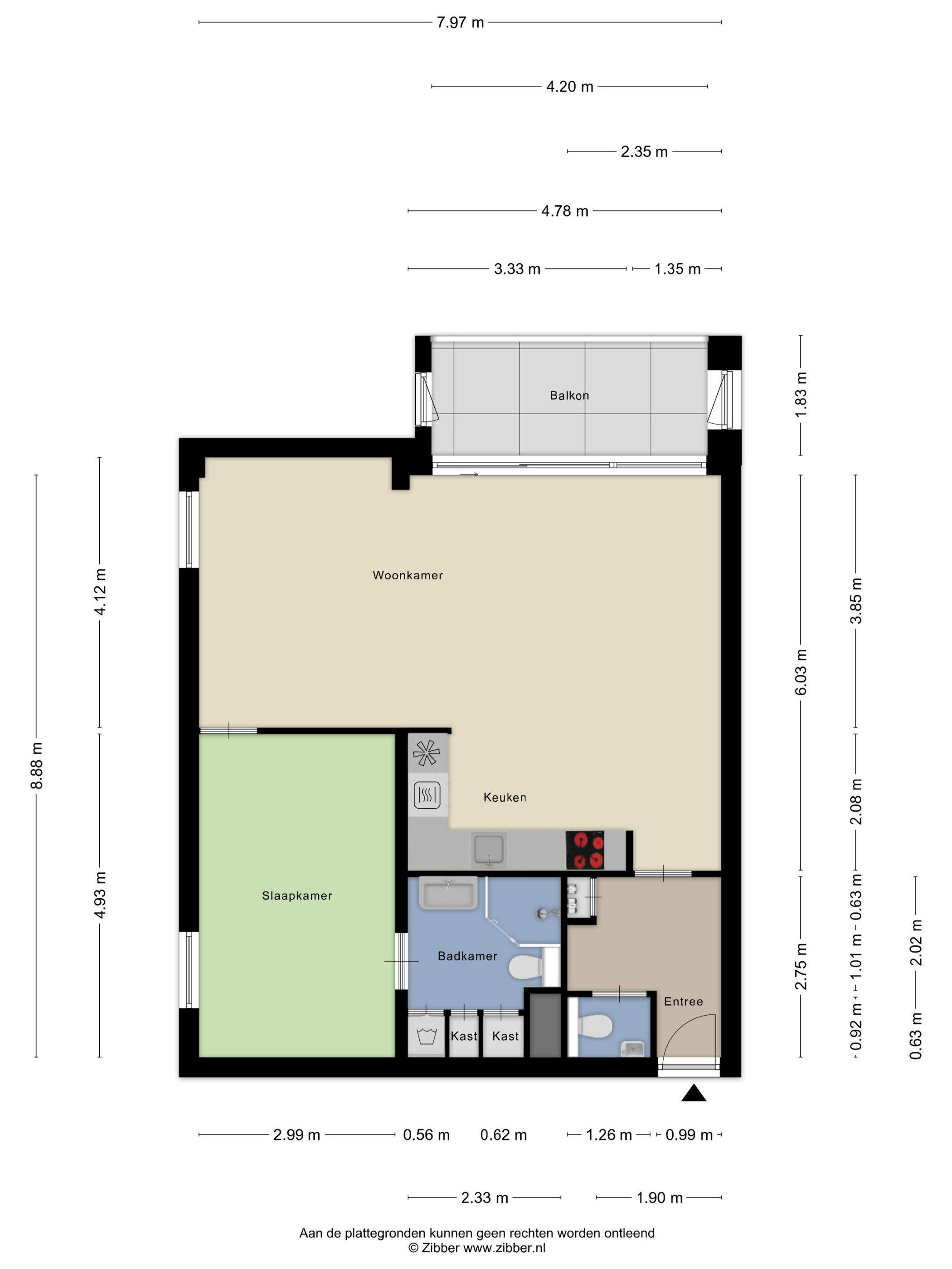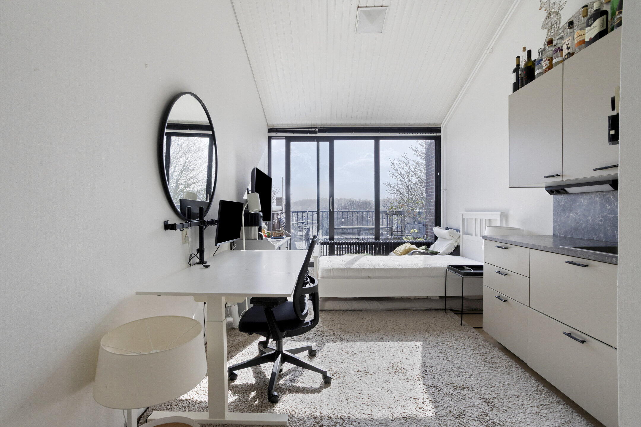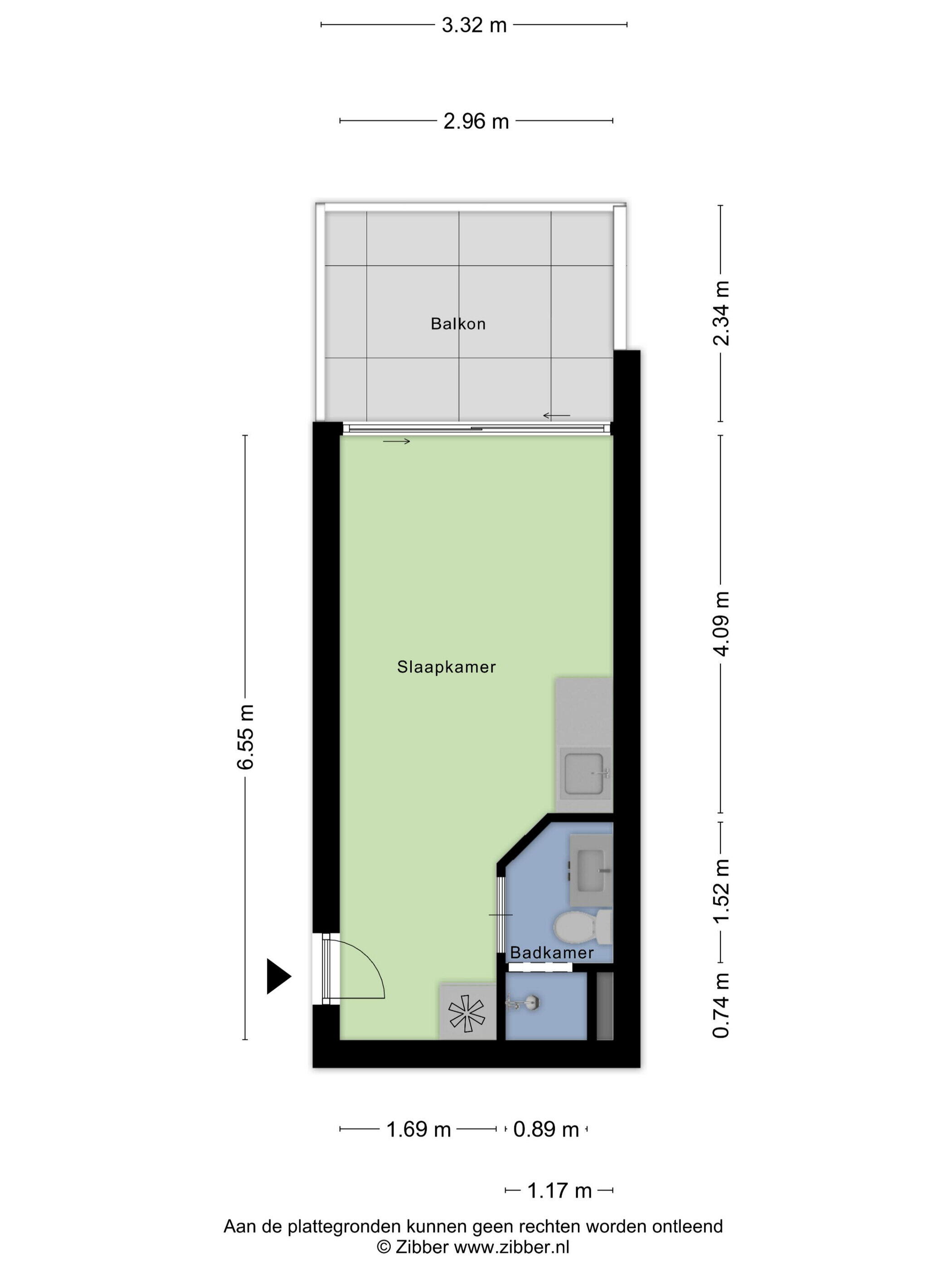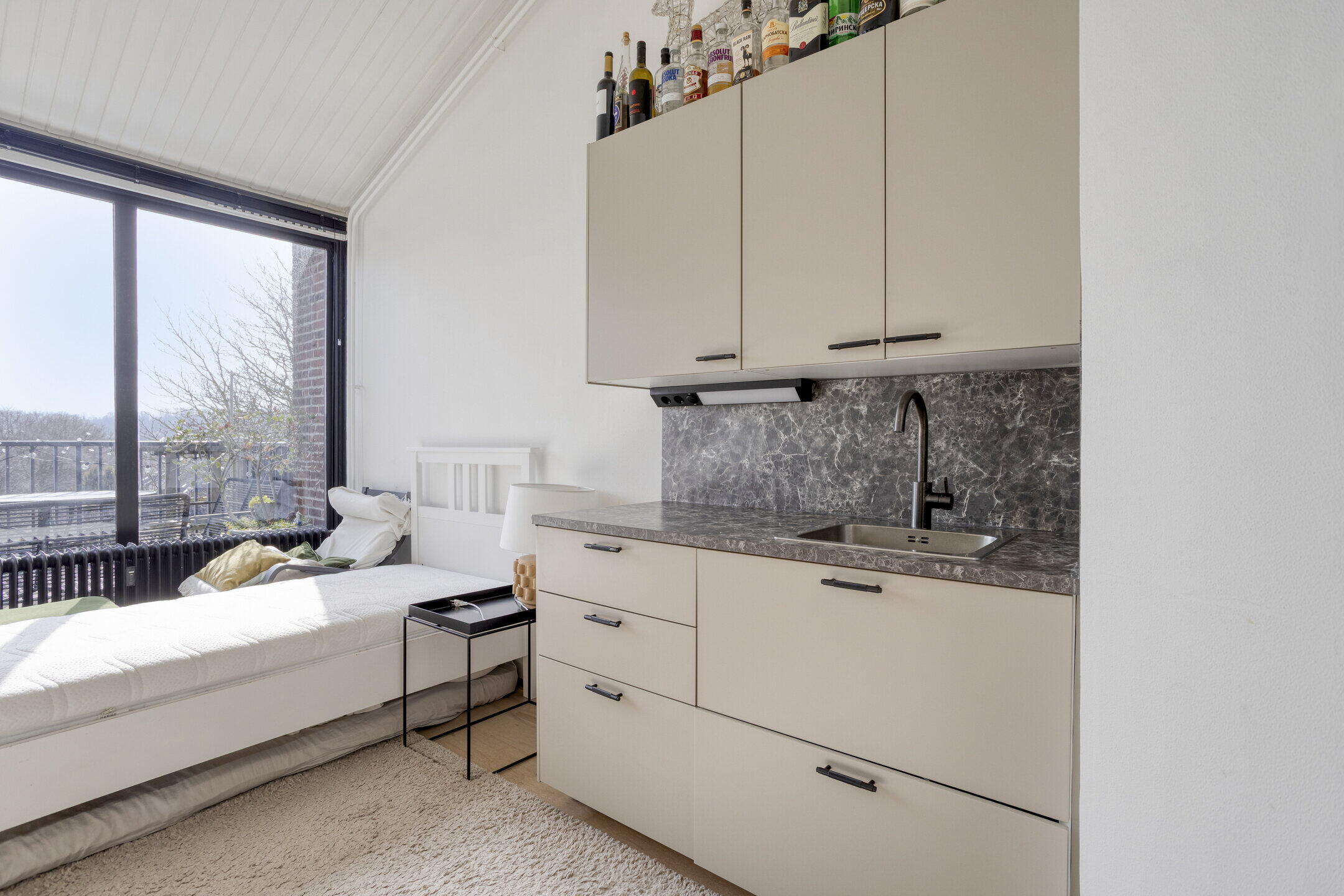 - Living/study/slaapkamer van circa 2,95 x 6,55 m. v.v. modern keukenblok met onder- en bovenkasten;