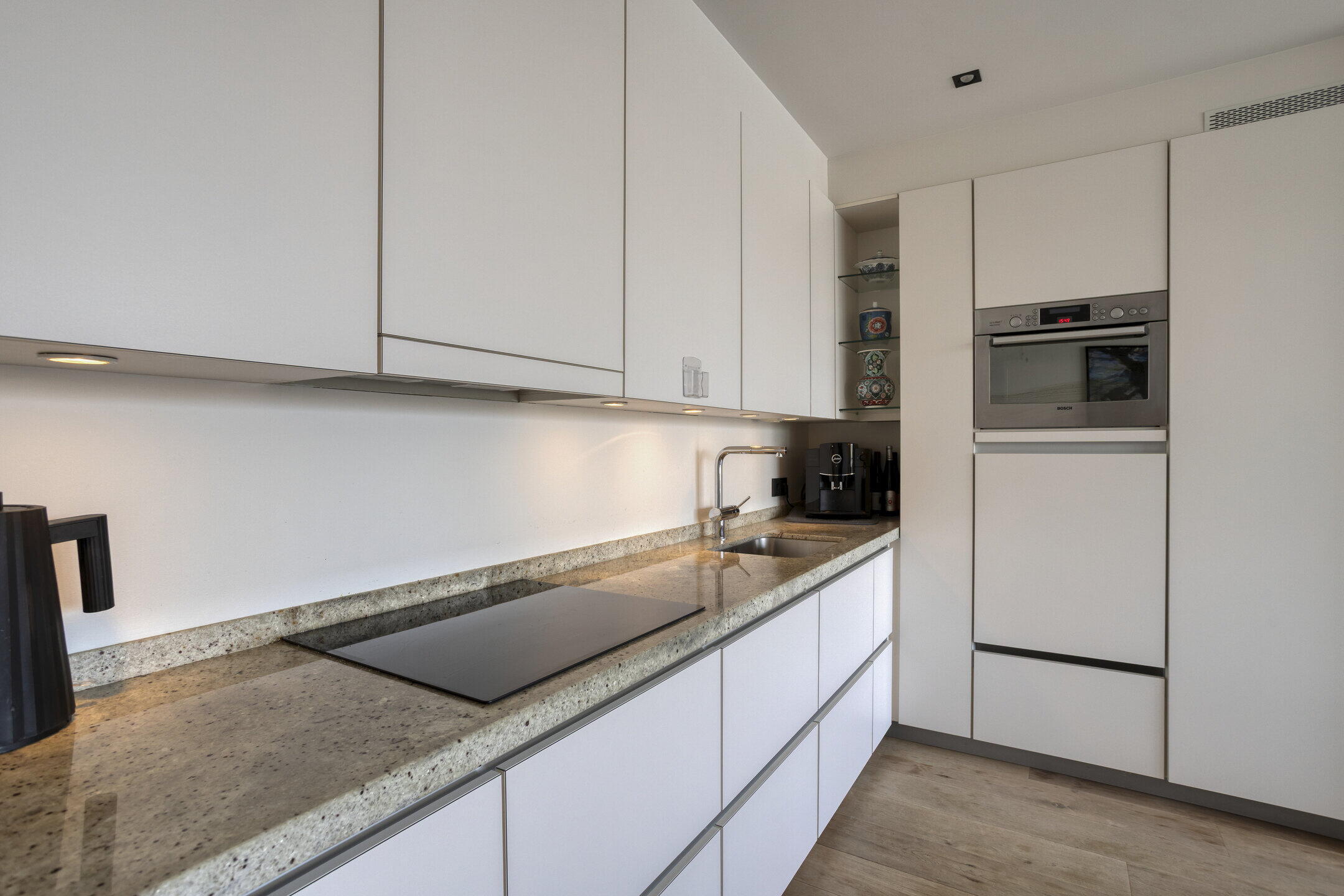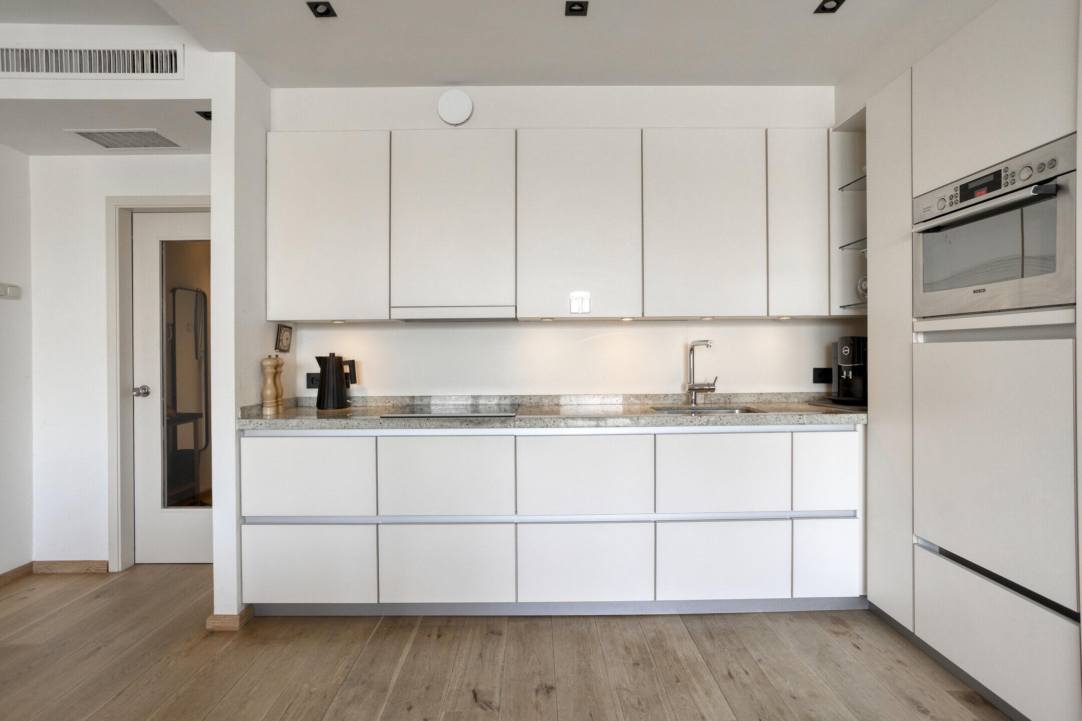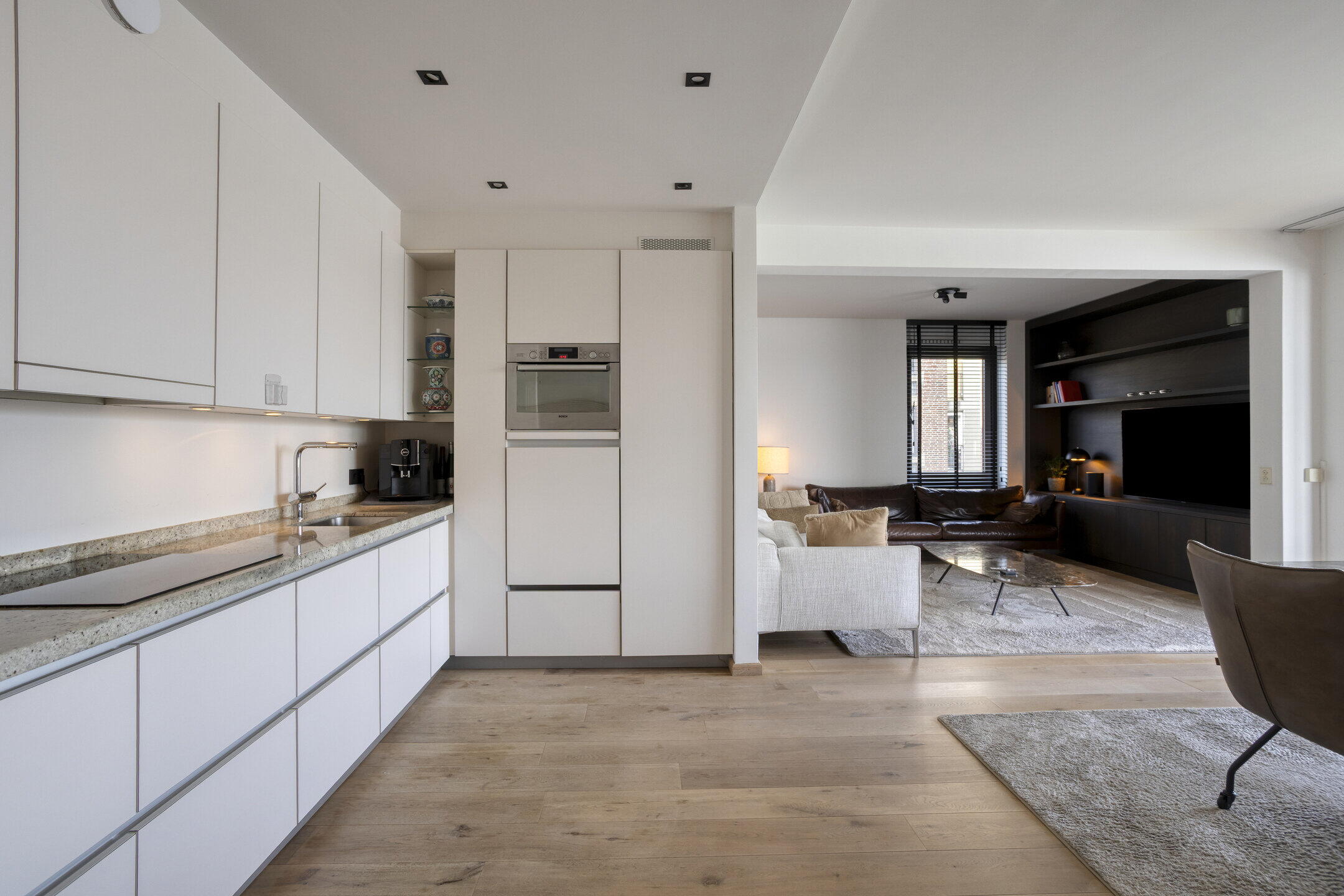 - Open keuken v.v. moderne hoekopstelling met hoogwaardige inbouwapparatuur, waaronder een inductiekookplaat*, inbouwafzuigkap, combi-oven, koelkast*, vriezer*, vaatwasser* op werkhoogte, spoelbak, granieten werkblad (apparatuur met * is recent vernieuwd);