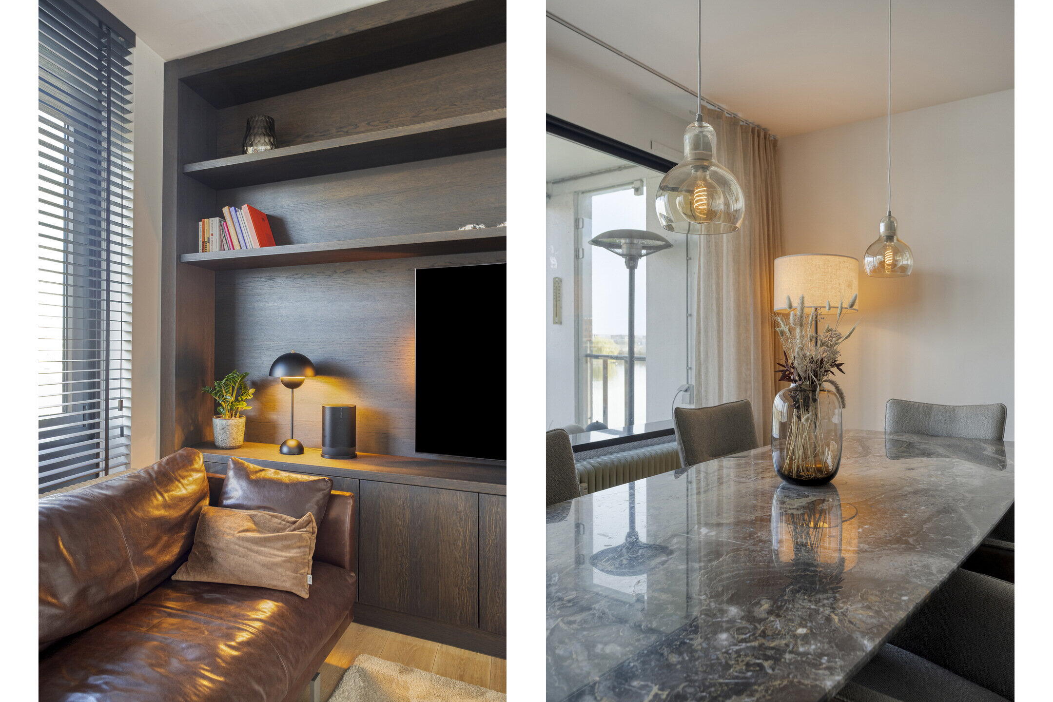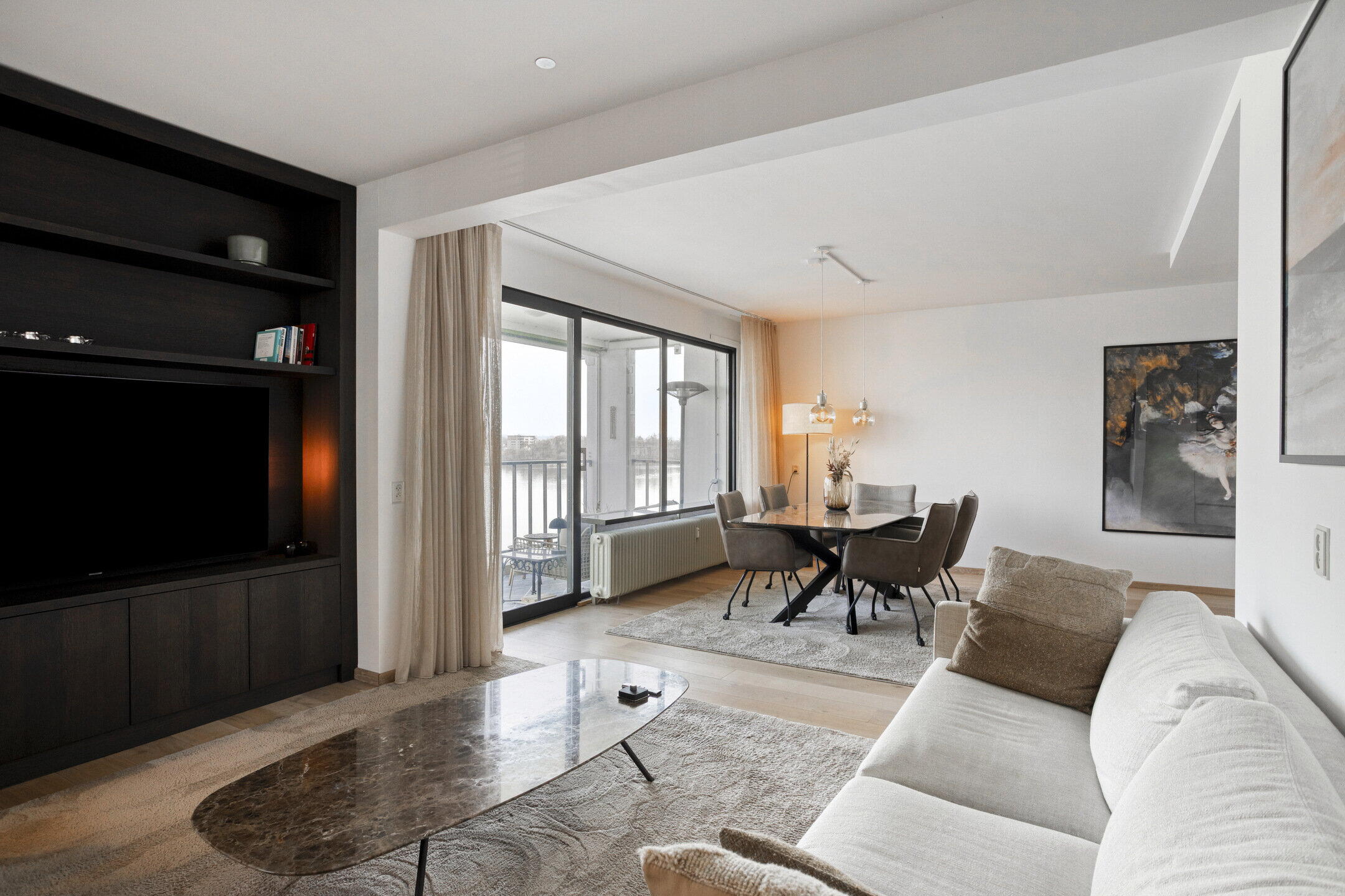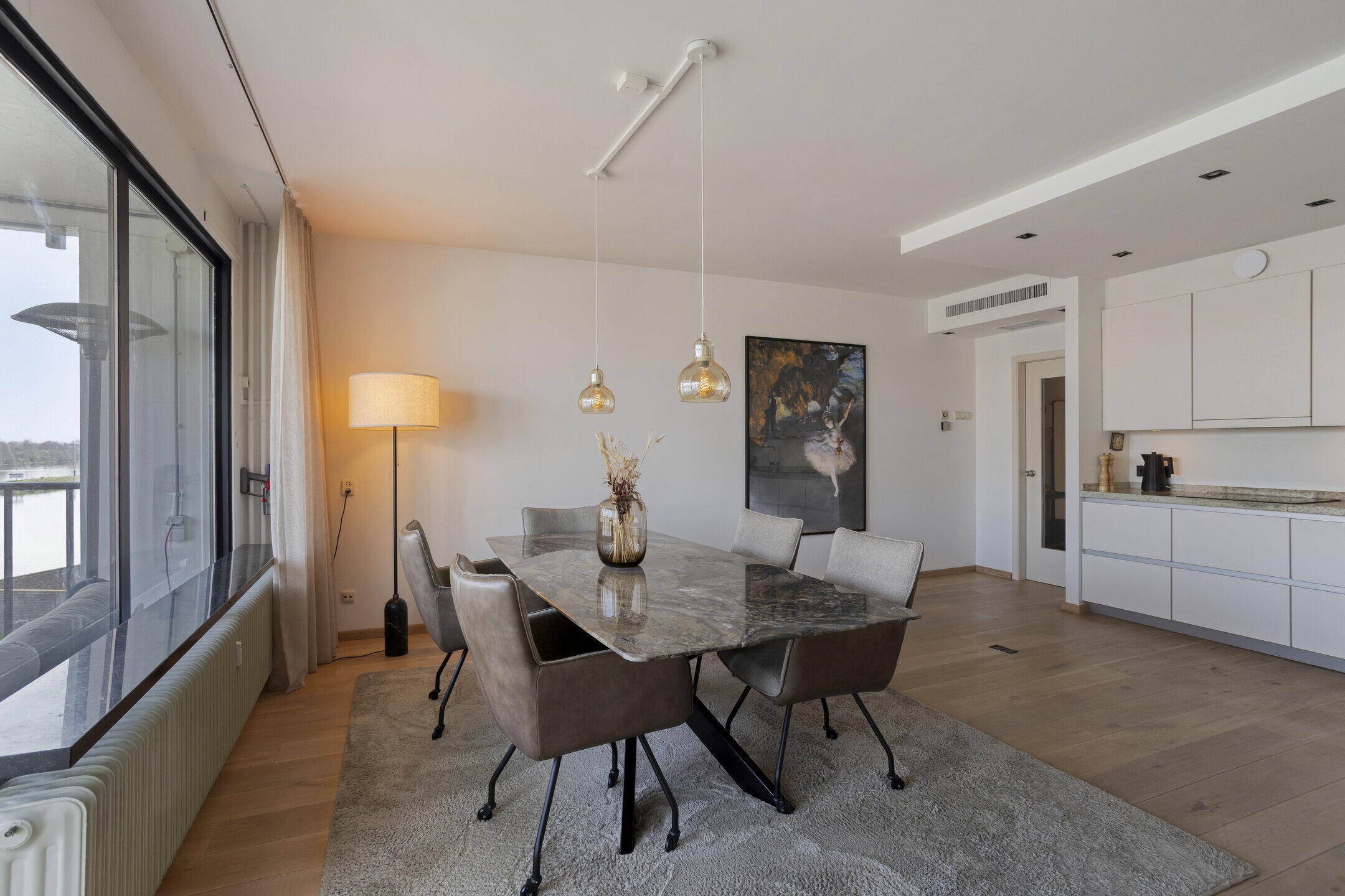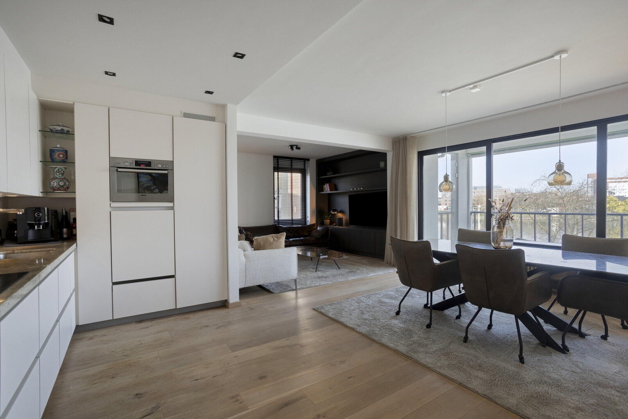 - Heldere, royale woonkamer (ca. 35 m2, afm. 7,97 x 6,05/4,18 m), hoekligging met zijraam en brede schuifpui naar balkon aan de Maas;