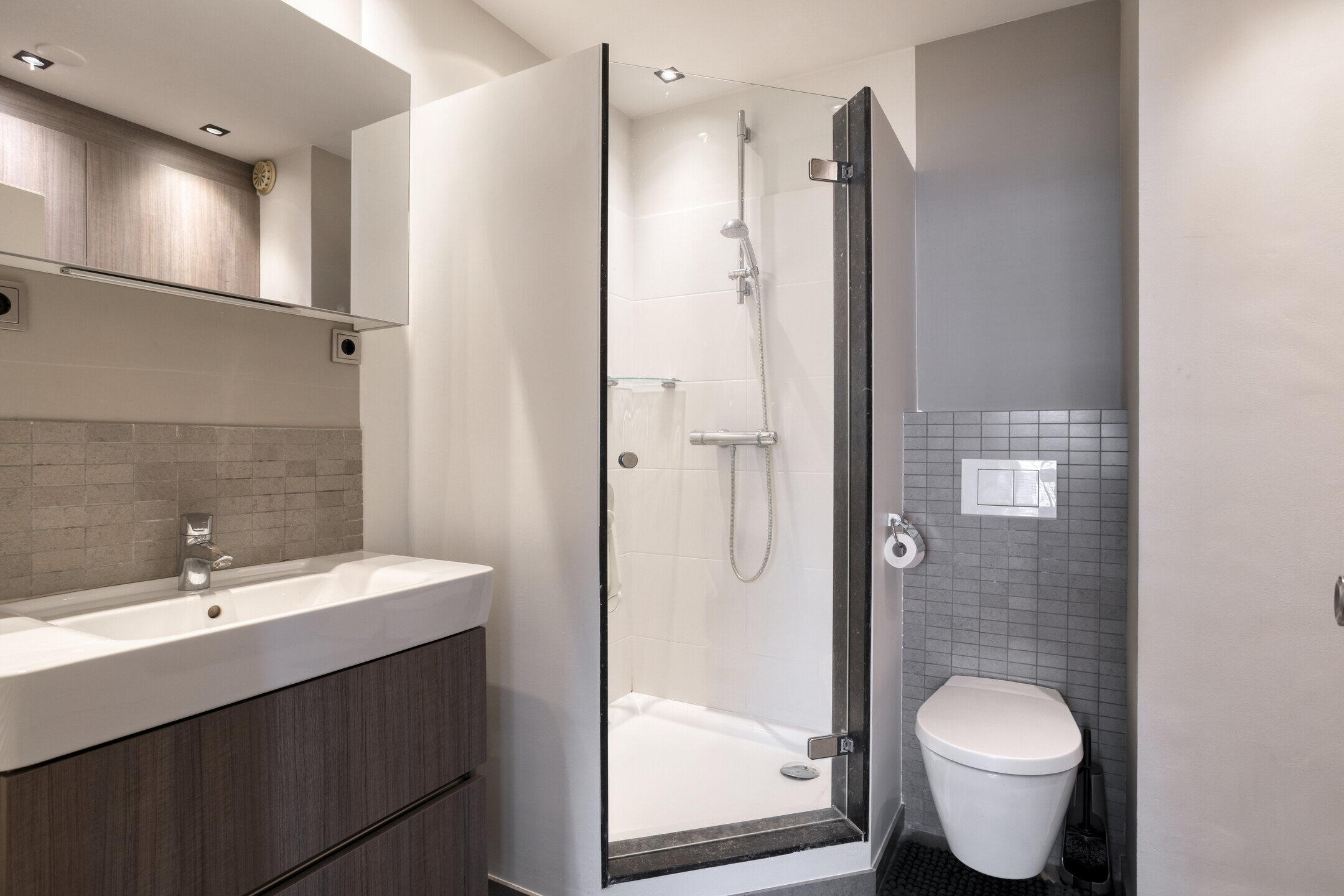 - Badkamer v.v. inloopdouche, wastafel en toilet.